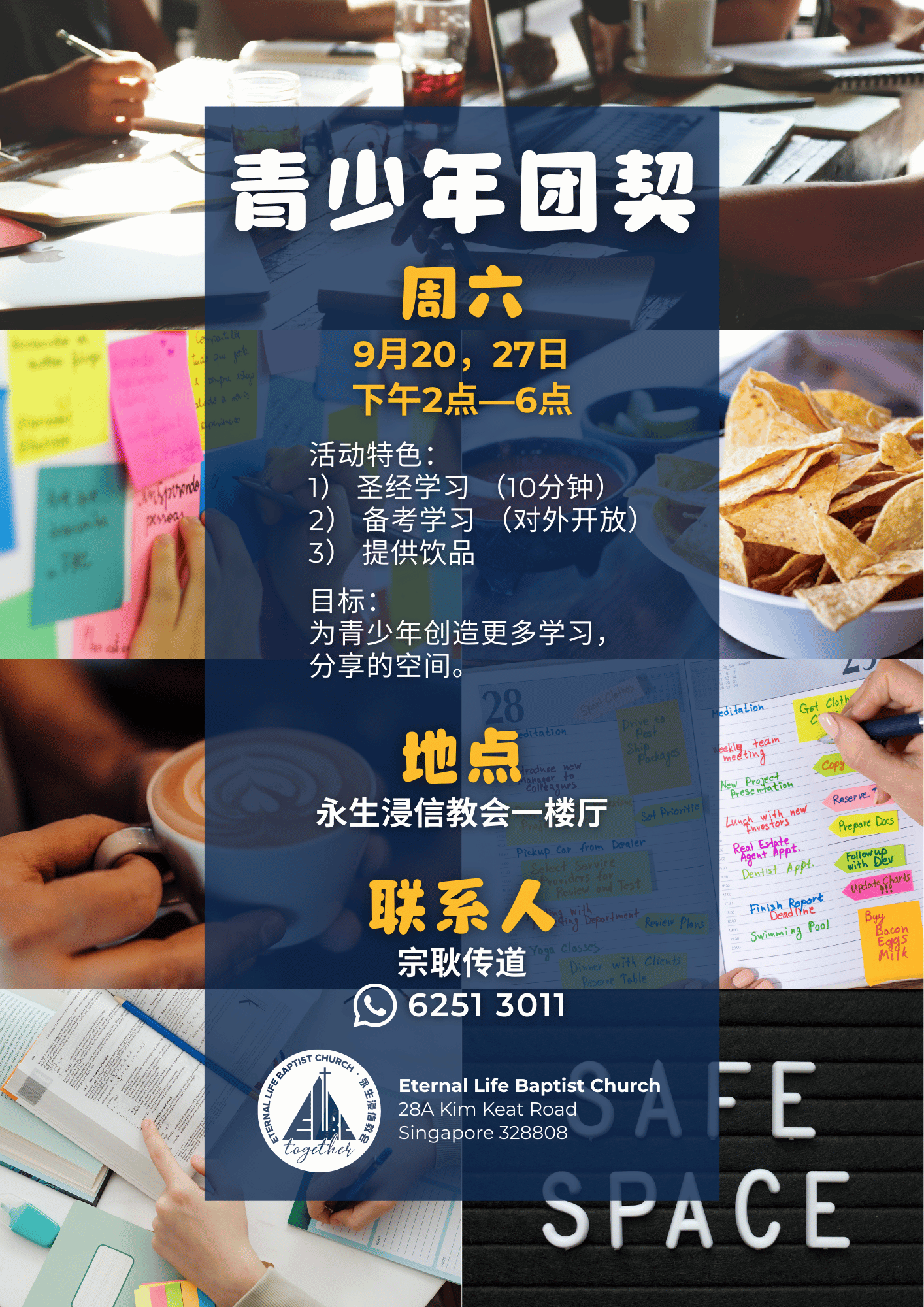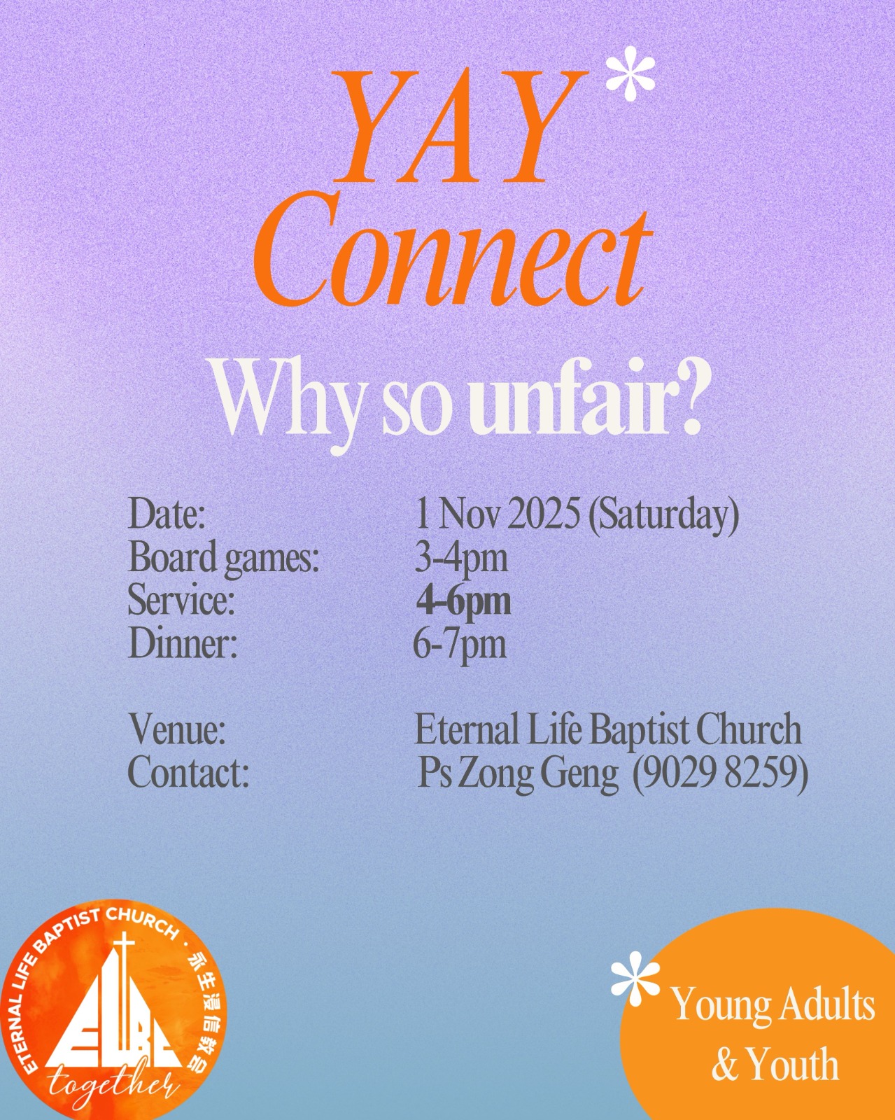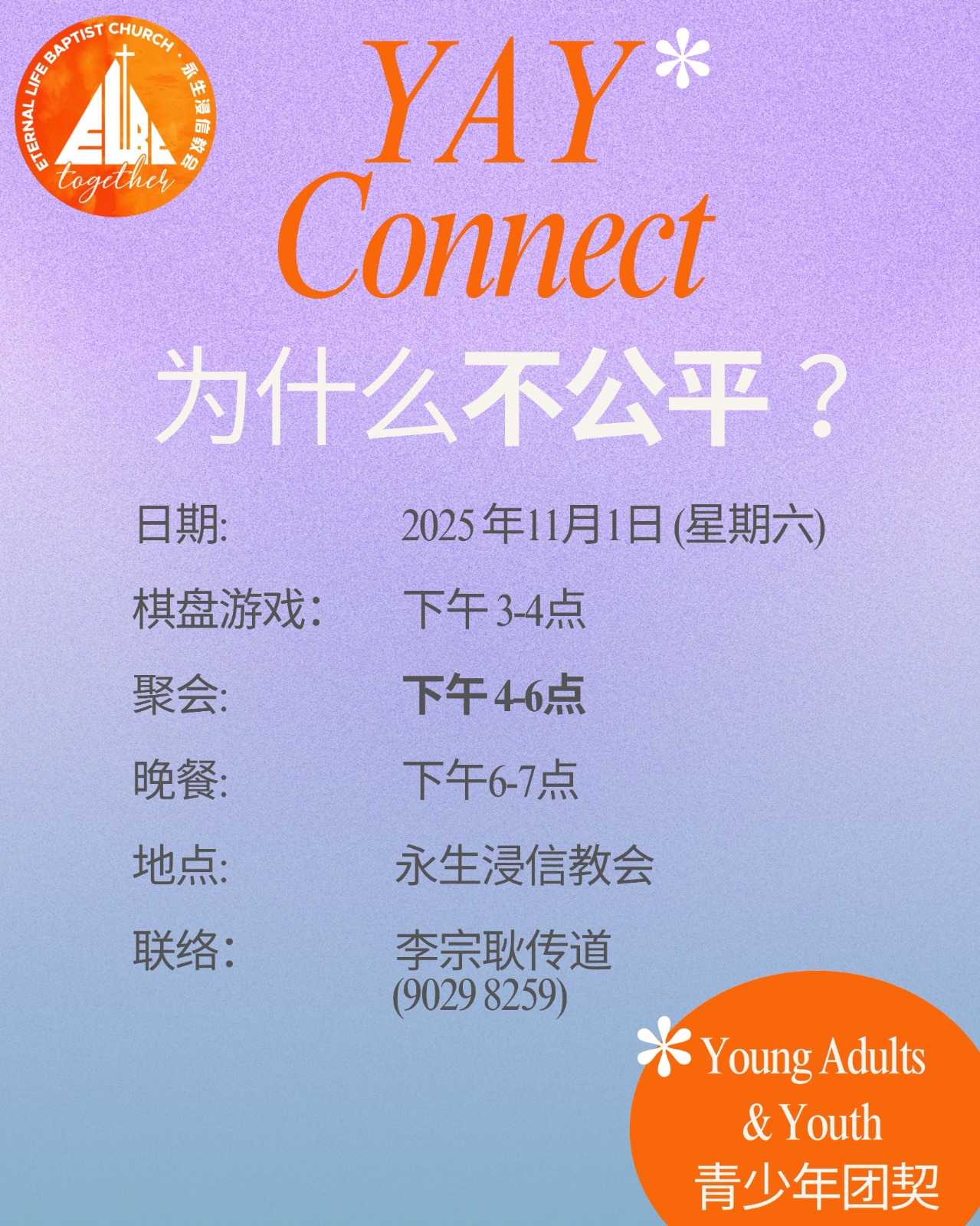 青年事工 (YAY) 是一个充满爱与喜乐的事工,面向青少年(13-19 岁)和青年(20-35 岁)!欢迎加入我们的青年时间(每周六下午 4-6 点)或 YAY Connect 活动(每月第一个周六下午 4-6 点)。